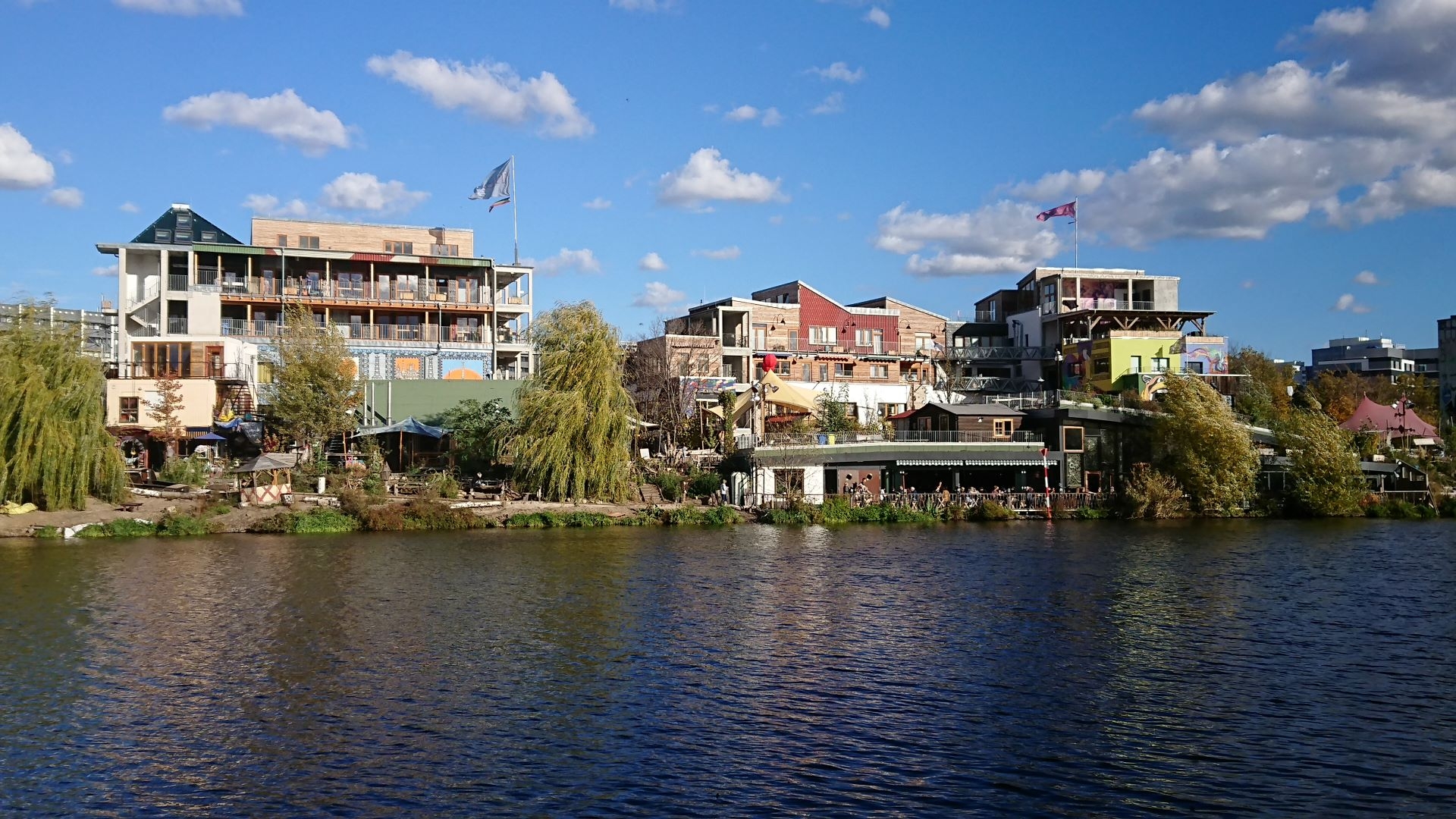 Beim Bau werden, soweit möglich, recycelte Materialien aus der Region verwendet. Baustoffe wie schwarzer Schiefer, rotes Wellblech und alte Scheunensteine bilden eine Symbiose mit moderner Street Art. Dabei kommen selbst Elemente, die bereits in der Bar 25 und im Kater Holzig verbaut waren, wieder zum Einsatz. Jedes Gebäude ist individuell gestaltet, wodurch das Quartier in seiner Gesamtheit selbst zum Kunstwerk wird. Durch einfaches, kostengünstiges und teilweise in Eigenleistung realisiertes Bauen stellt die Holzmarkt-Genossenschaft bezahlbare innerstädtische Mieten für Handwerker, Künstler und Kreative im Dorf sicher.